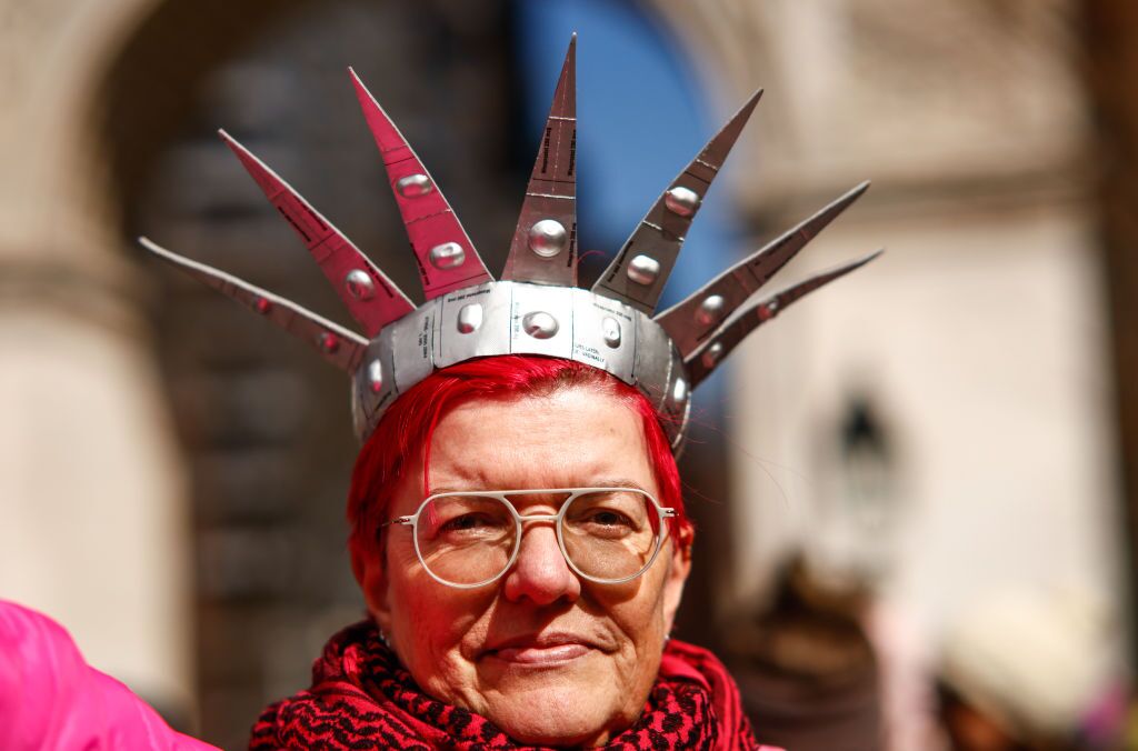Artist Airco Caravan wears a crown made with abortion pills at a march on March 8, 2025, International Women’s Day, in New York City. (Kena Betancur / Getty Images)